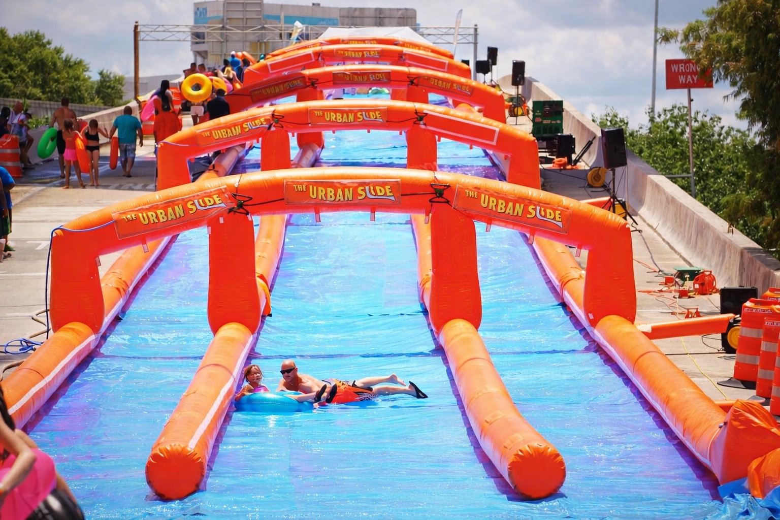 Our flagship. A 1,000-foot modular water slide that shuts down streets and opens up cities.